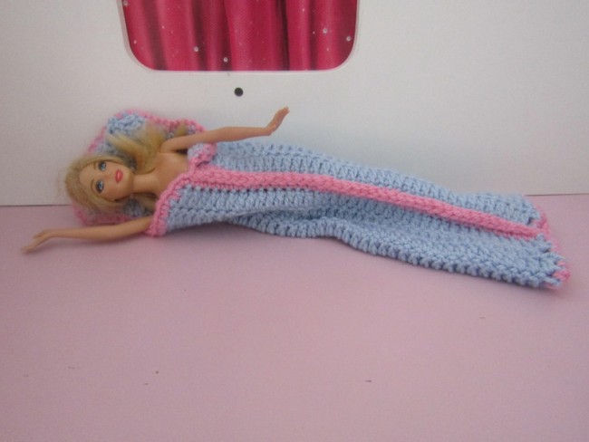 Sac de couchage fait main au crochet pour poupée Barbie.